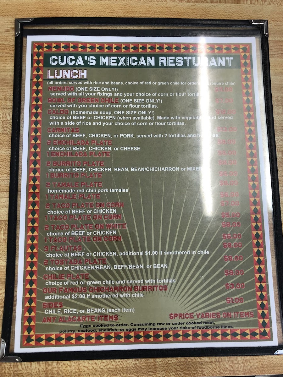 Introducing the menu at Cuca's Mexican, a hidden gem located at 1227 E Routt Ave, Pueblo, CO, where authentic flavor shines without breaking the bank. This family-owned restaurant is celebrated for its fresh, hot dishes and generous portions. Diners rave about the authenticity of the Mexican cuisine, making it a go-to spot for those yearning for traditional tastes.